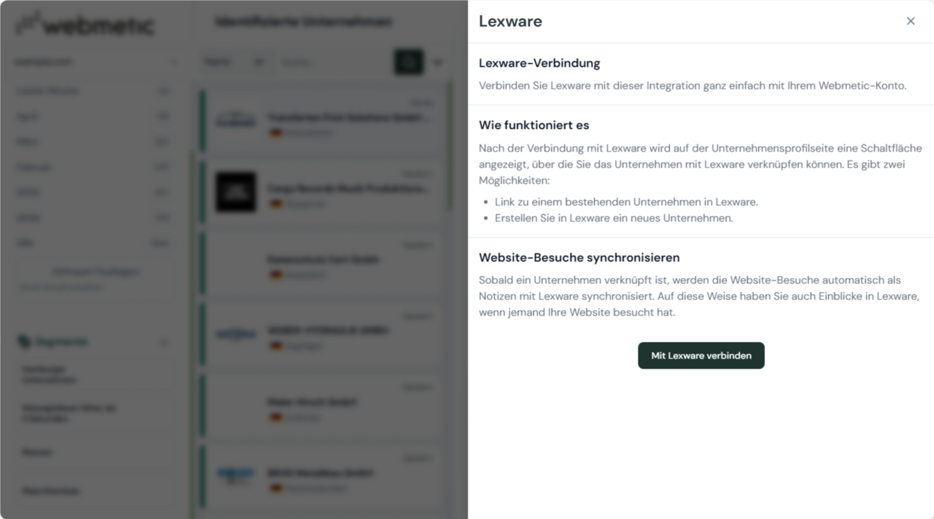 Mit Webmetic identifizierst du anonyme Unternehmensbesucher auf deiner Website und gewinnst wertvolle B2B Leads. Die innovative Technologie erkennt, welche Unternehmen deine Website besuchen – ohne Cookies und 100% DSGVO-konform. Detaillierte Unternehmensdaten wie Firmenname, Branche und Standort können nahtlos in Lexware Office importiert werden, sodass du potentielle Neukunden und Bestandskunden direkt in deiner Buchhaltungssoftware erfassen und verwalten kannsr. Steigere deinen Vertriebserfolg durch die automatisierte Lead-Erfassung und optimiere deine Geschäftsprozesse vom ersten Kontakt an.
