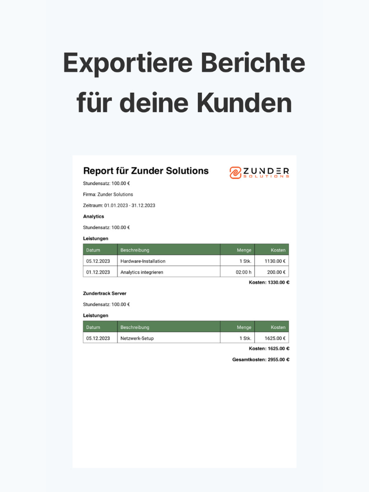 Schnell, präzise und kostenlos abrechnen: Mit Zundertrack verwandelst du erfasste Arbeitszeiten direkt in professionelle Rechnungen. Minimiere Verluste, maximiere abrechenbare Stunden – einfach, effizient und völlig kostenlos.