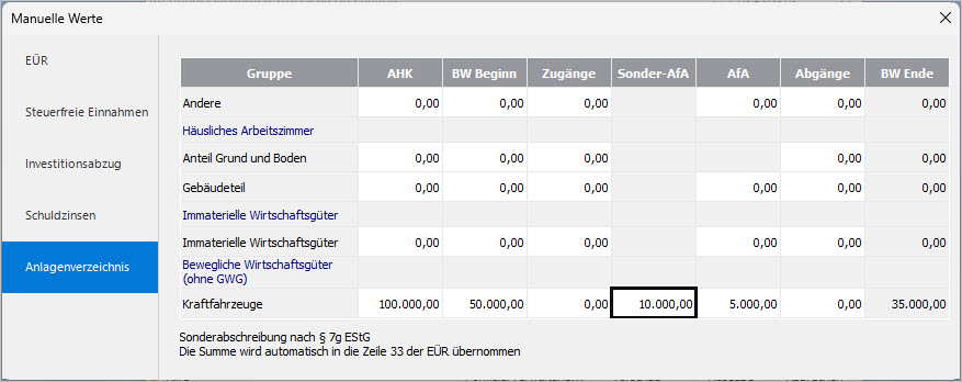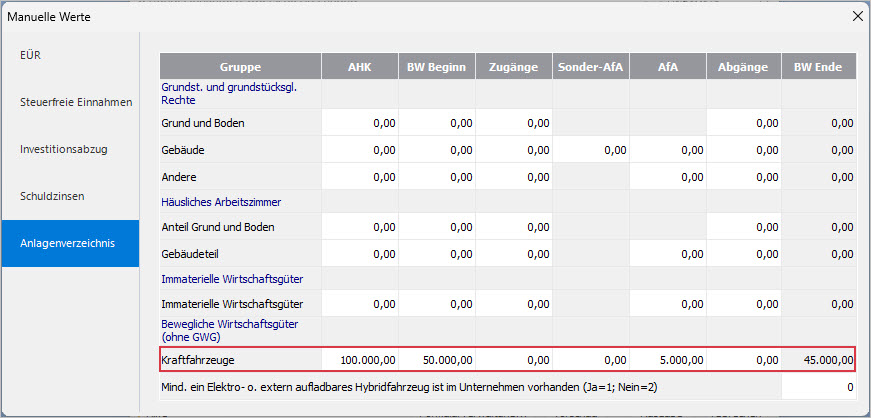 Hinweis: Falls kein manueller Wert im Anlagenverzeichnis erfasst wird, werden die Werte aus den Konten in das Formular Anlage EÜR übertragen.