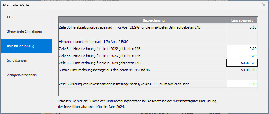 - Erfassen Sie den Betrag unter 'Hinzurechnung für die in 2024 gebildeten IAB (Investitionsabzugsbeträge)'.