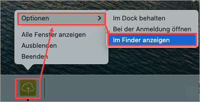 - Klicken Sie auf das 'Archivierungssymbol - Optionen - Im Finder anzeigen'.