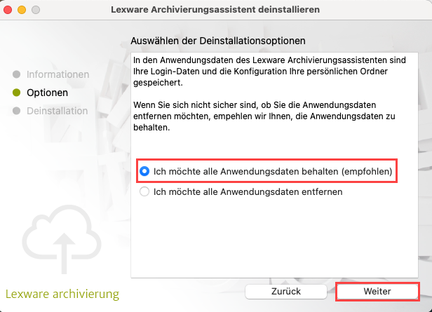 - Aktivieren Sie den Eintrag 'Ich möchte alle Anwendungsdaten behalten (empfohlen).