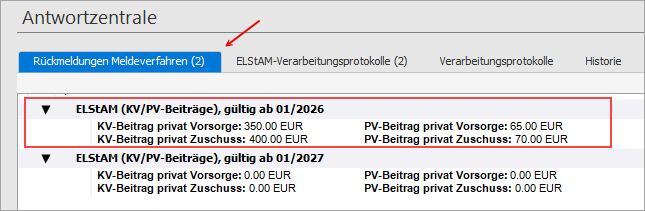 Die elektronisch abgerufenen PKV-Beiträge gelten erstmalig ab 01. Januar 2026. Aus diesem Grund können Sie die Beiträge erst nach der Installation des Updates Januar 2026 aus der Antwortzentrale in die Mitarbeiterstammdaten übernehmen.