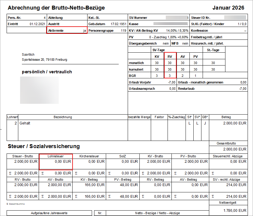 Für Mitarbeiter die bereits die Regelaltergrenze erreicht haben und in der Beitragsgruppe mit RV = 1 (voller Beitrag) oder 3 (halber Beitrag) geschlüsselt sind, können Sie die 'Aktivrente' abrechnen.