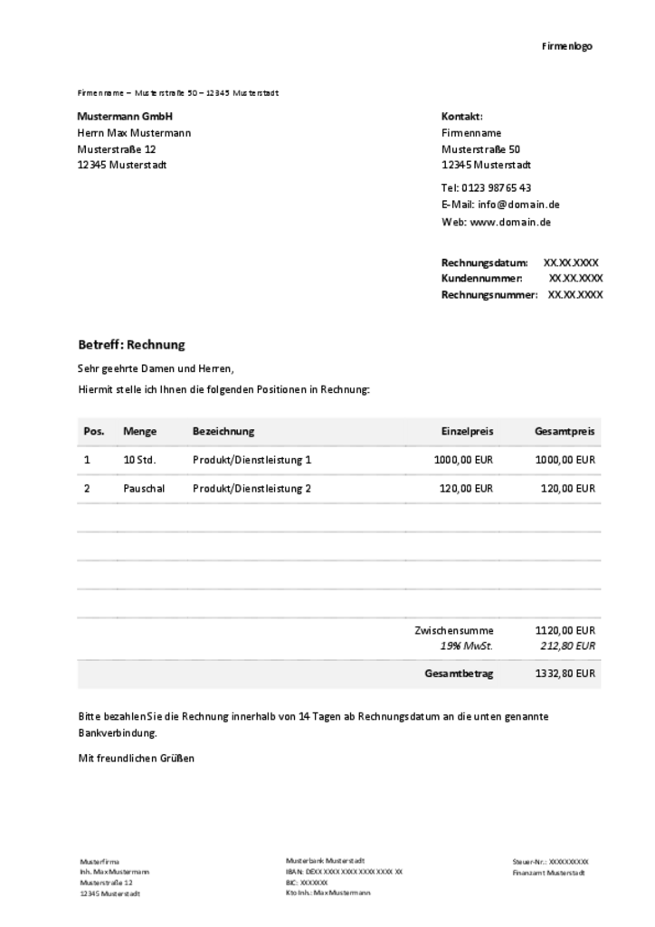 Als steuerpflichtiger Unternehmer müssen Sie in Ihren Rechnungen die Umsatzsteuer ausweisen. Die Umsatzsteuer sowie alle weiteren Pflichtangaben sind bereits in der Rechnungsvorlage enthalten.