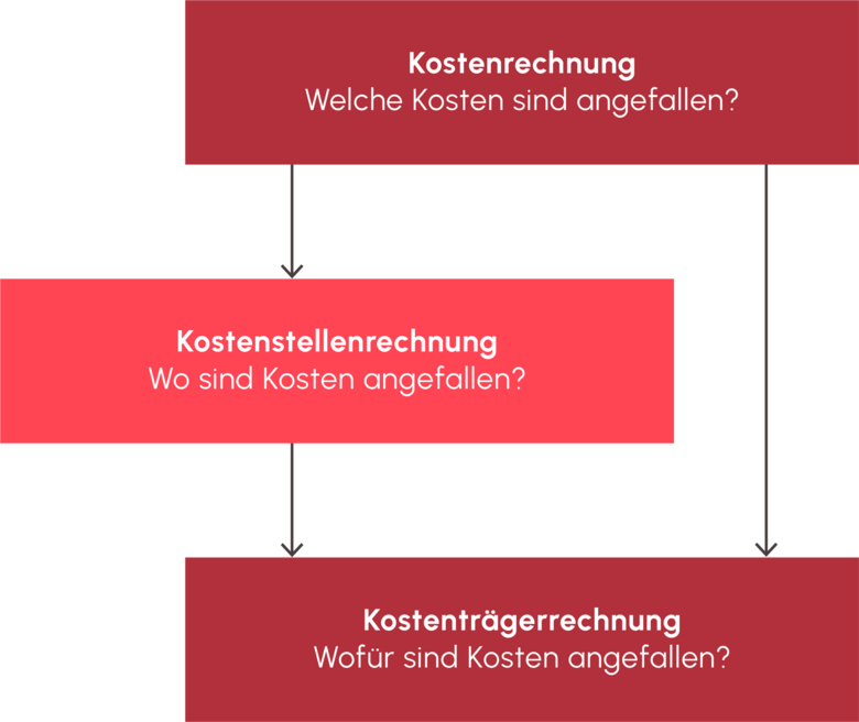 - Die Kostenrechnung besteht aus drei Hauptbereichen: Kostenarten-, Kostenstellen- und Kostenträgerrechnung.
