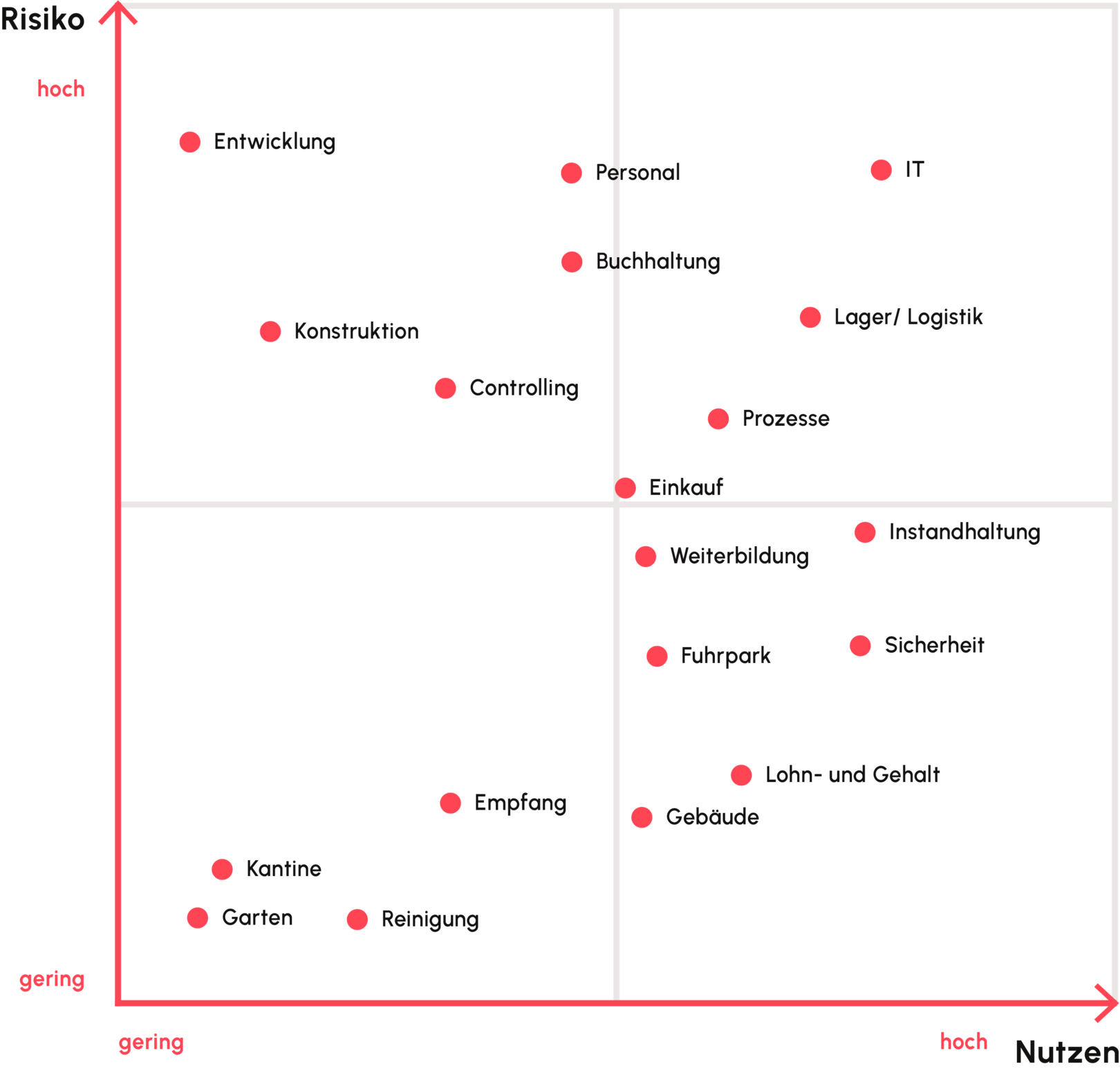 Für Unternehmen bieten sich zahlreiche Möglichkeiten, Aufgaben und Abteilungen auszulagern. In den Fokus des Outsourcings gelangen auch zunehmend die Bereiche, die früher als kritisch und sensibel eingestuft wurden. Die Abbildung zeigt, welche Bereiche mit einem hohen Risiko einhergehen und wo sich der Nutzen der Auslagerung vorteilhaft auswirkt. Zu betonen ist, dass Sie stets eine genaue Abwägung vornehmen sollten, ob das Outsourcing nötig ist. Überlegen Sie sich, welche Kernbereiche Ihr Unternehmen definieren und welche nicht ausgelagert werden sollten.