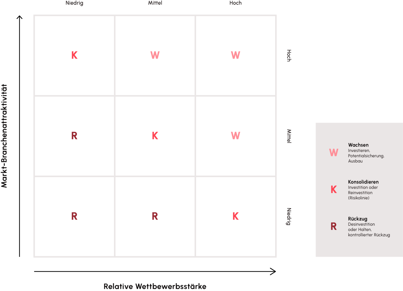 - Marktattraktivität und Wettbewerbsstärke: Berücksichtigt mehrere externe und interne Faktoren